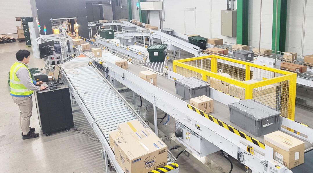 | CJ대한통운 스타벅스 남부권센터에서 자동화 설비를 따라 상품을 담은 박스가 이동하고 있다.[사진=CJ대한통운] |