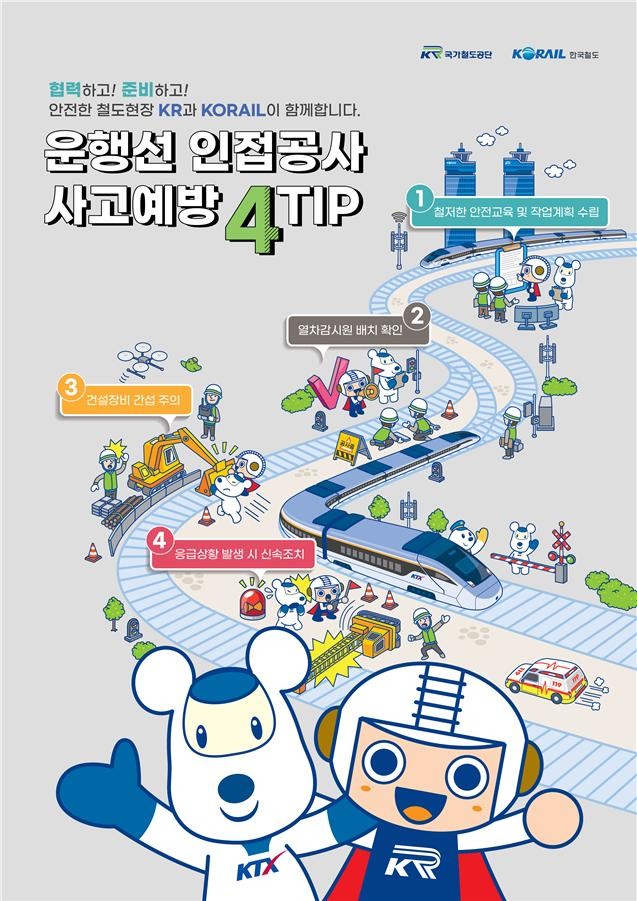 공단 캐릭터 ‘레일로’와 코레일 캐릭터 ‘키로’가 등장하는 포스터는 철도 운행선 인접공사 사고 예방을 위한 ▲안전교육 및 작업계획 수립 ▲열차감시원 배치 확인 ▲건설장비 간섭 주의 ▲응급상황 발생 시 신속조치 4가지 필수 안전 수칙이 포함됐다.