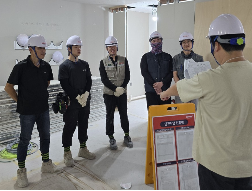 | 오스템임플란트 인테리어 시공팀이 현장 작업 전 안전 교육을 하는 모습. [사진=오스템임플란트] |