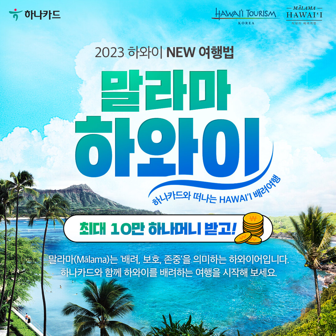 [하비엔뉴스 = 송현섭 기자] 하나카드는 하와이 여행에 특화된 혜택들을 모아 ‘하나카드와 하와이 가시면 감사하와이’ 이벤트를 진행한다고 22일 밝혔다.
