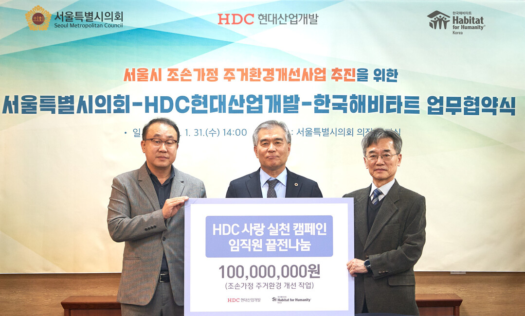 HDC현대산업개발이 이날 기탁한 1억원은 서울시 관내 조손가정의 노후 거주지의 리모델링과 같은 주거환경개선사업에 활용될 예정이다.