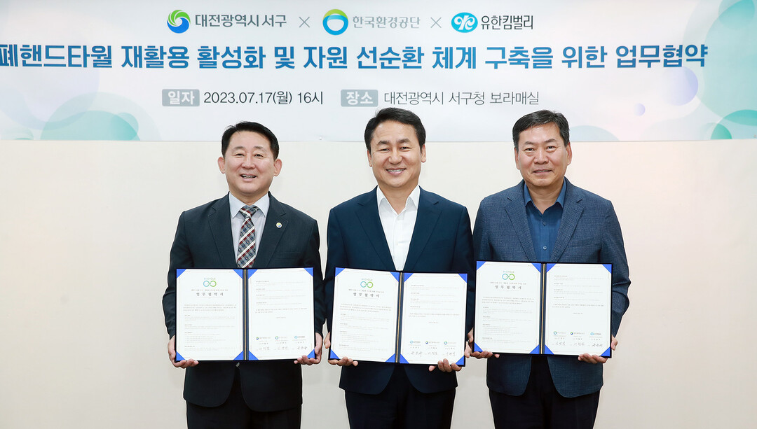 [하비엔뉴스 = 홍세기 기자] 유한킴벌리가 대전광역시 서구청, 한국환경공단 충청권환경본부와 함께 광역단위 폐핸드타월 수거 및 재활용 활성화를 통해 자원 선순환 체계구축에 나선다.