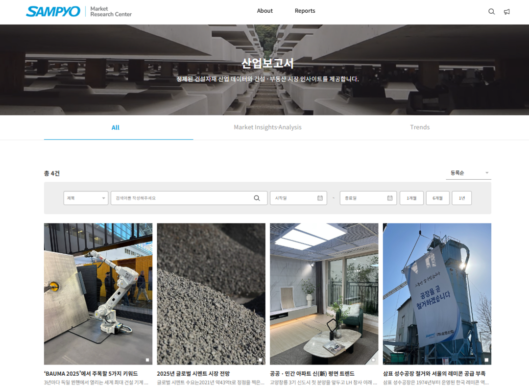 현재 홈페이지에는 서울 건설현장의 레미콘 수급 불안 상황을 다층적으로 살펴본 ‘삼표 성수 공장 철거와 서울의 레미콘 공급 부족’을 시작으로 ‘2025년 글로벌 시멘트 시장 전망’, ‘공공-민간 아파트 신(新) 평면 트렌드’ 등을 다룬 산업보고서를 확인할 수 있다.