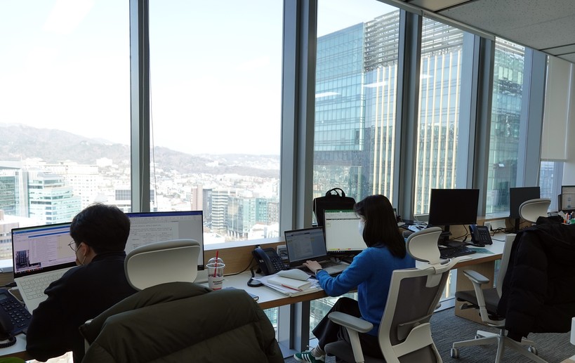 | ▲ CJ대한통운 본사에 마련된 카페형 창가좌석에서 근무하고 있는 직원들 모습. [사진=CJ대한통운] |