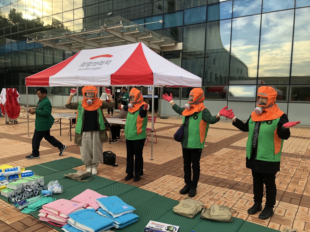 | 재해구호 전문인력 양성교육에 참여한 교육생들이 ‘화재대피 및 화생방교육’ 실습을 하고 있다. [사진=희망브리지] |