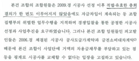 하지만 지난 2009년 결의 내용의 경우 자금의 차입과 방법, 이율, 상환방법 등에 대한 구체적인 내용이 없어 정상적인 결의로 보기 힘들다는 게 조합원들의 주장이다.