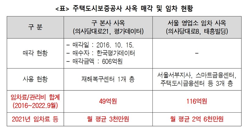 | ▲ 주택도시보증공사 사옥 매각 및 임차 현황. |