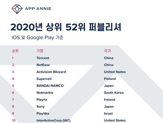 앱애니가 이날 공개한 '2020년 상위 퍼블리셔 어워드(TPA 2020)'에 따르면 넷마블은 52개 업체 중 중국 텐센트·넷이즈, 미국 액티비전 블리자드와 핀란드 슈퍼셀, 일본 반다이남코에 이어 6위에 이름을 올렸다.