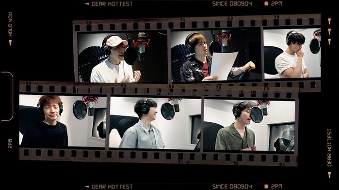 'DEAR HOTTEST'라는 문구로 시작한 이번 영상에는 팬들이 보고 싶어 한 2PM의 모습이 가득 담겨 더욱 기분 좋은 선물이 됐다. 여섯 멤버는 녹음 부스 안에서 가창에 집중하고 진지하게 모니터링에 임하는 등 프로페셔널한 면모는 물론 카메라를 향해 환한 미소를 지어 보이는 여유로움까지 갖추며 매력을 뽐냈다.