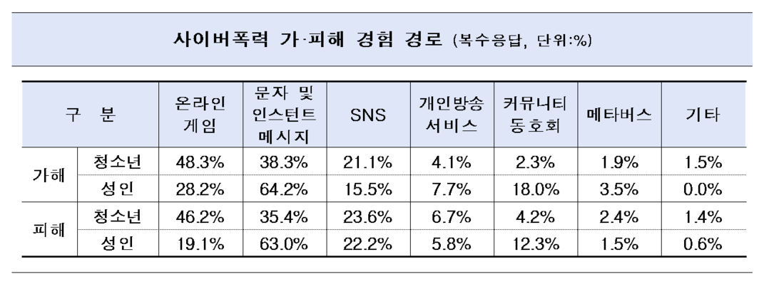 사이버폭력의 가·피해 경험은 청소년·성인 모두 남성, 청소년은 중학생, 성인은 20대가 높았고, 청소년은 온라인 게임(48.3%), 성인은 문자 및 인스턴트 메시지(64.2%)를 통해 가장 많은 사이버폭력을 행사한 것으로 나타났다.