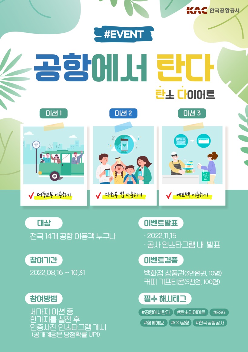 ‘탄다’ 이벤트는 △공항으로 이동할 때 버스·지하철 등 대중교통을 이용하거나 △공항 내 상업시설 이용 시 개인 텀블러 등 다회용컵 사용 또는 △에코백을 사용하는 모습 중 한가지 미션을 실천한 사진을 찍어 필수 해시태그와 함께 자신의 인스타그램에 업로드해 참여할 수 있다.