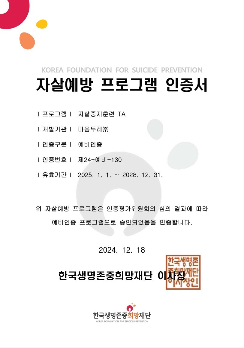 김도윤 마음두레 대표는 “이번 인증은 마음두레의 자살예방 전문성과 교육 역량을 인정받은 뜻깊은 성과다”라며 “앞으로도 TA 프로그램을 통해 더 많은 사람들이 위험에서 벗어나도록 도와 생명을 지키는 데 일조하겠다”라고 말했다.