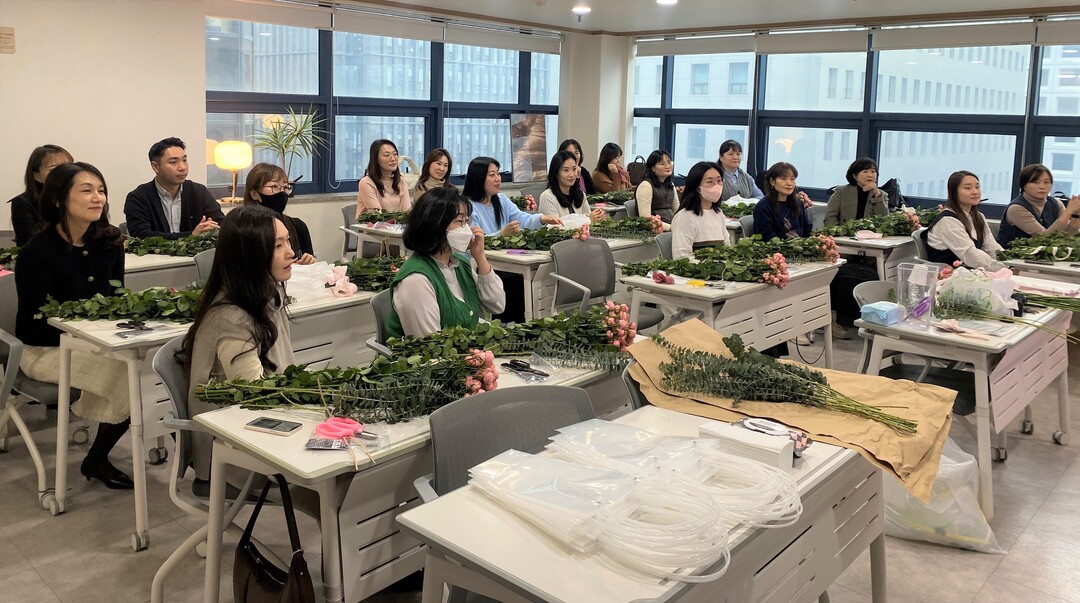 | 미래에셋생명 임직원들이 ‘브릿지 워크숍’ 프로그램의 일환으로 마련된 꽃꽂이수업에 참여하고 있다. [사진=미래에셋생명] |