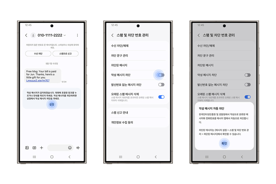 | 삼성전자와 한국인터넷진흥원(KISA)이 협업해 개발한 ‘악성 메시지 차단 기능’. [사진=삼성전자] |