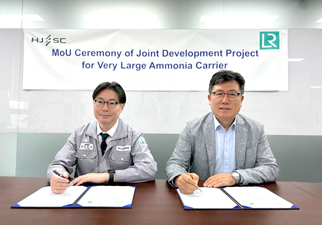| HJ중공업과 로이드선급(LR) 간 공동개발협약식 모습. (왼쪽부터) 김보언 HJ중공업 기술영업 담당 상무, 김영두 로이드선급 GTSO 한국대표 [사진=HJ중공업] |