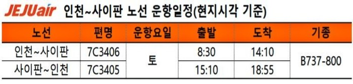 | ▲ 인천~사이판 노선의 운항 스케줄은 주1회(토요일) 일정 |