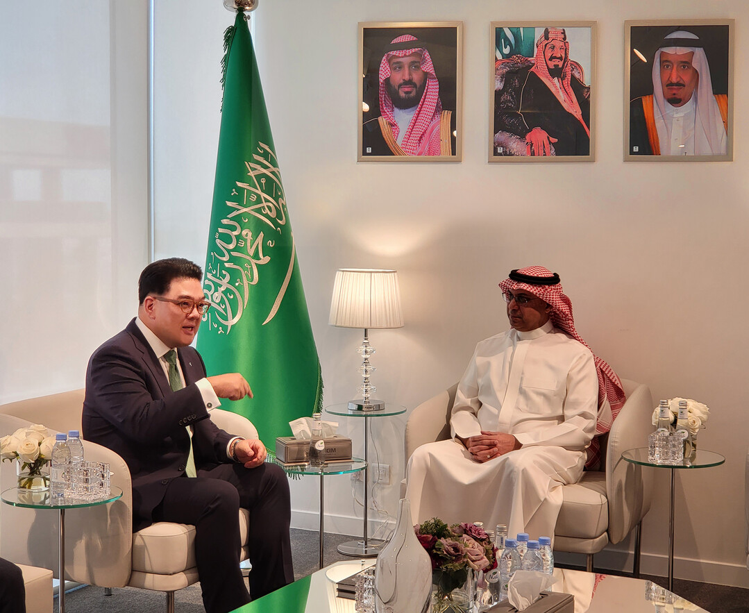| 지난 25일(현지시간) 이은형(왼쪽) 하나금융그룹 부회장이 사아드 알 칼브 사우디 수출입은행 회장과 환담하고 있다. [사진=하나금융그룹] |