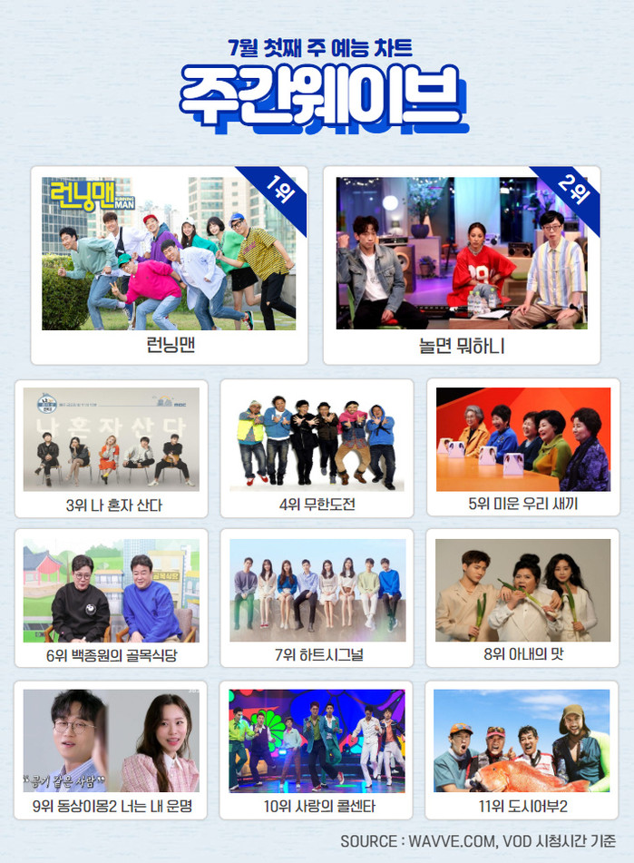 7일 웨이브 주간 예능 차트에 따르면 유재석 예능 '런닝맨'과 '놀면 뭐하니'가 1위와 2위, 3위 '나 혼자 산다'와 4위 '무한도전' 역시 전 주와 동일한 3,4위를 기록하며 순위 변동이 없어 눈길을 끌었다.