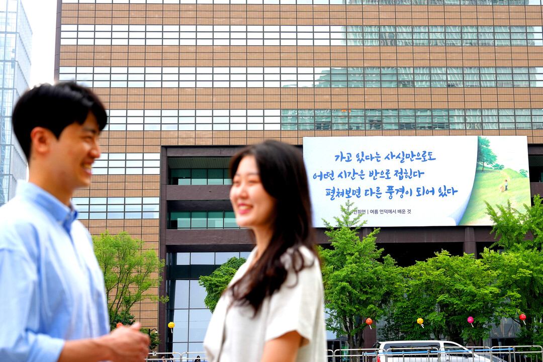 [하비엔뉴스 = 송현섭 기자] 교보생명은 광화문글판 여름편으로 안희연 시인의 작품 ‘여름 언덕에서 배운 것’에서 발췌한 문구를 채택해 새롭게 단장했다고 30일 밝혔다.
