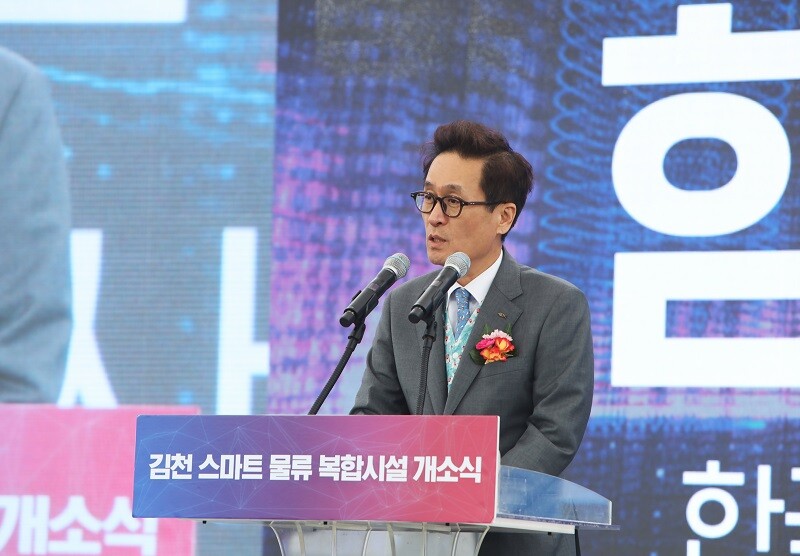 | 김천 스마트 물류센터에서 함진규 도로공사 사장이 개소식에서 축사를 하고 있다. [사진=한국도로공사] |