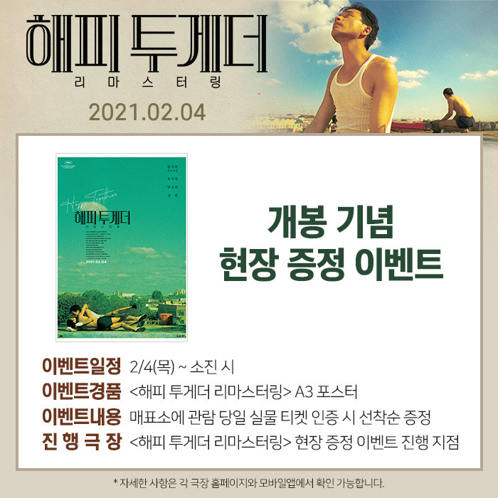 이처럼 기대를 한껏 고조시키고 있는 <해피 투게더 리마스터링>이 개봉을 기념해 현장 이벤트를 진행한다. 2월 4일부터 해당 이벤트를 진행하는 극장에서 <해피 투게더 리마스터링>을 관람하고 관람 당일 실물 티켓을 매표소에 인증하는 관객에게 A3 포스터를 증정하는 것.