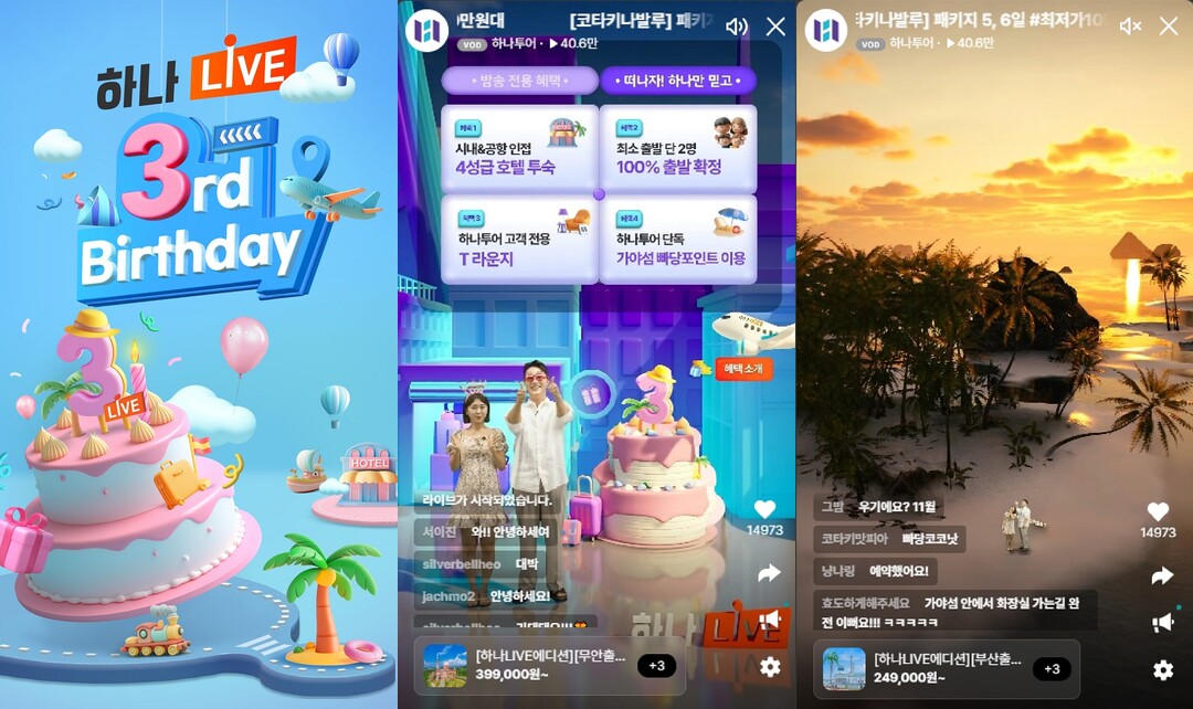 이를 통해 오는 11월4일 성도 자이언트판다 패키지 방송에 이어 세부 J PARK 리조트(11일), 괌 PIC 리조트(18일), 캄보디아 패키지여행(25일)를 각각 방송한다. 하나LIVE는 앞서 지난 14일과 21일 코타키나발루와 스페인 패키지 상품을 방송했고, 이 가운데 코타키나발루는 방송 시작 3분 만에 일부 일자가 마감돼 라이브 역대 최단 시간 마감을 기록한 바 있다.