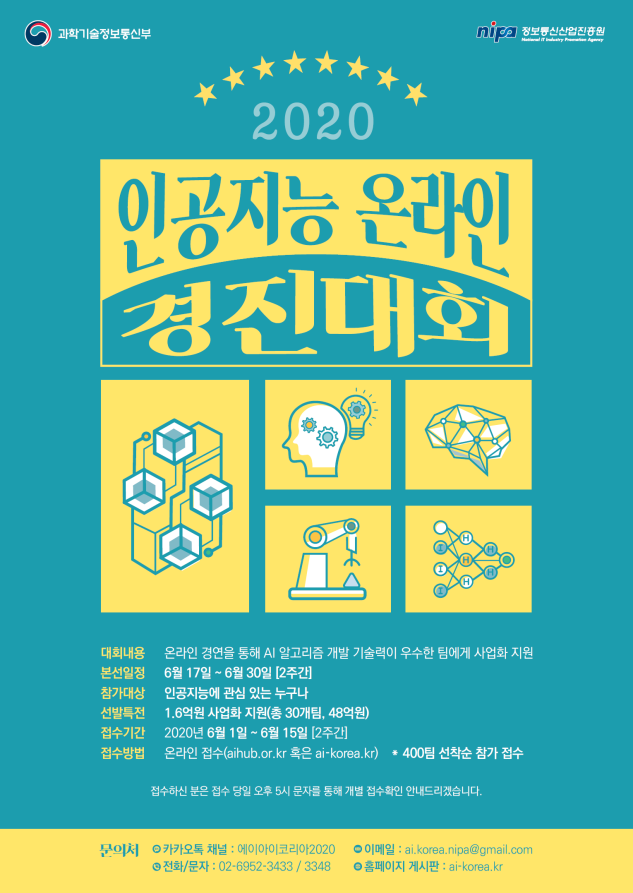 과학기술정보통신부(장관 최기영, 이하 ‘과기정통부’)는 온라인상에서 인공지능(AI) 알고리즘 개발 능력을 경연하는「2020 인공지능(AI) 온라인 경진대회」를 개최한다고 밝혔다.