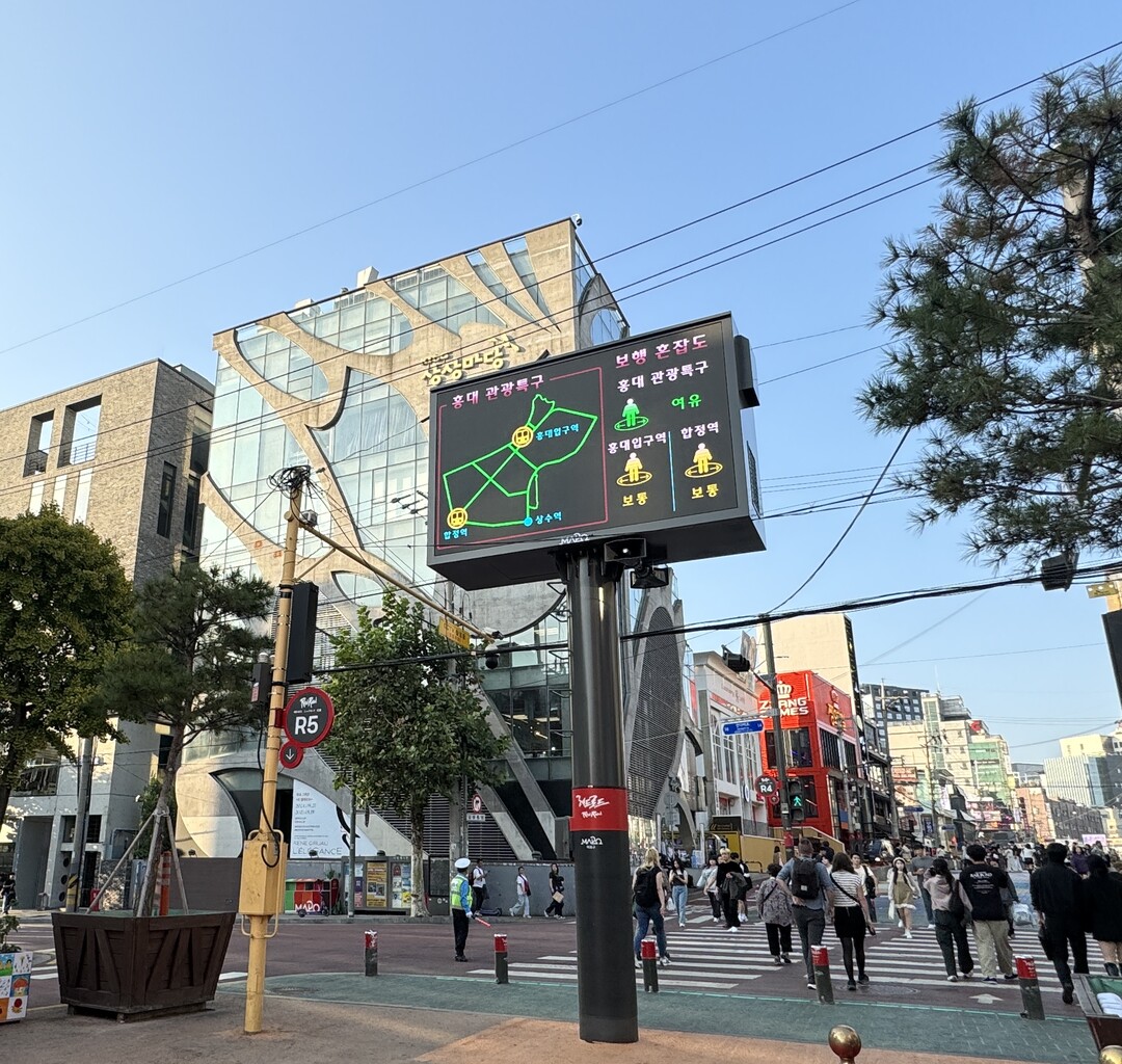 | 레드로드 R5에 설치된 재난문자전광판에 표출된 홍대관광특구 인파혼잡도 [사진=마포구] |