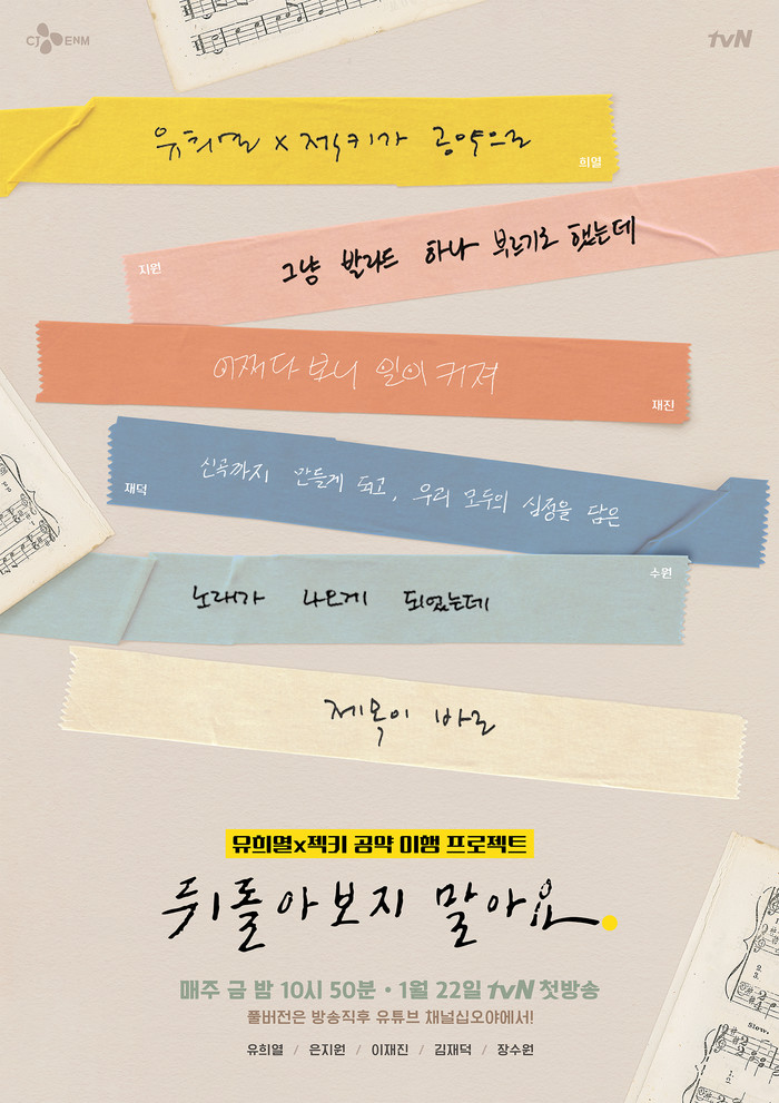 tvN ‘뒤돌아보지 말아요’는 오는 22일 밤 10시 50분경 첫 방송된다. ‘언제까지 어깨춤을 추게 할 거야’ 후속으로 5분 편성을 확정, 방송 이후 유튜브 ‘채널 십오야’를 통해 풀 버전이 공개된다.
