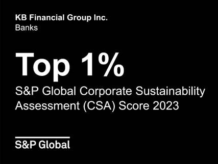 8일 KB금융에 따르면, ‘2023 기업 지속가능성 평가’의 최상위 등급인 ‘Top 1%’는 전 세계 약 9400개 기업 중 66개 기업이 선정됐으며, KB금융은 은행 산업부문에서 최고점인 86점을 획득해 ‘Top 1%’로 선정됐다.