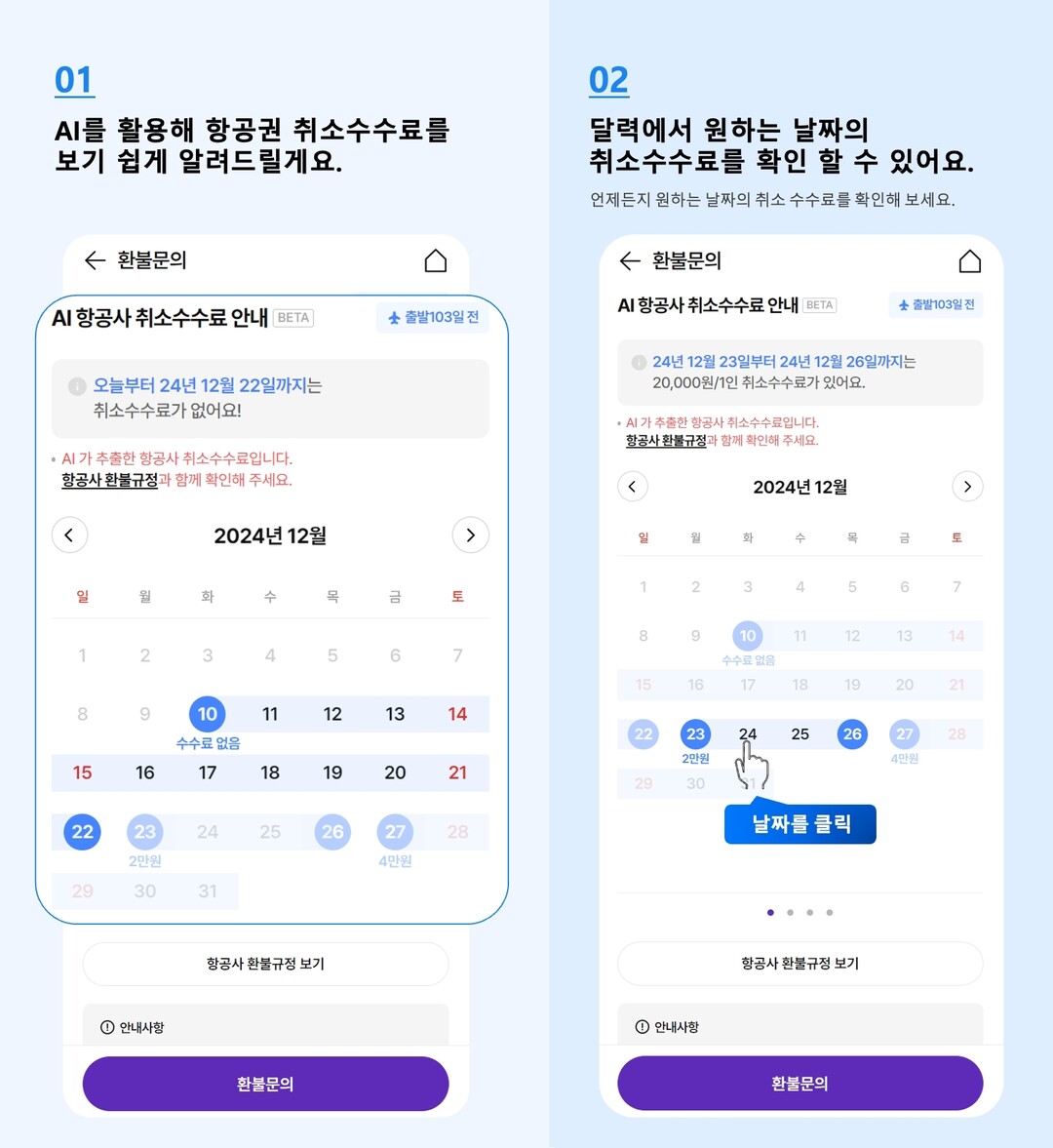 AI 환불금 캘린더는 항공사 취소 수수료 규정을 분석 및 학습한 AI가 취소 일자로부터 남은 출발일을 계산해 예상 환불금을 실시간으로 알려주는 고객편의 서비스다.