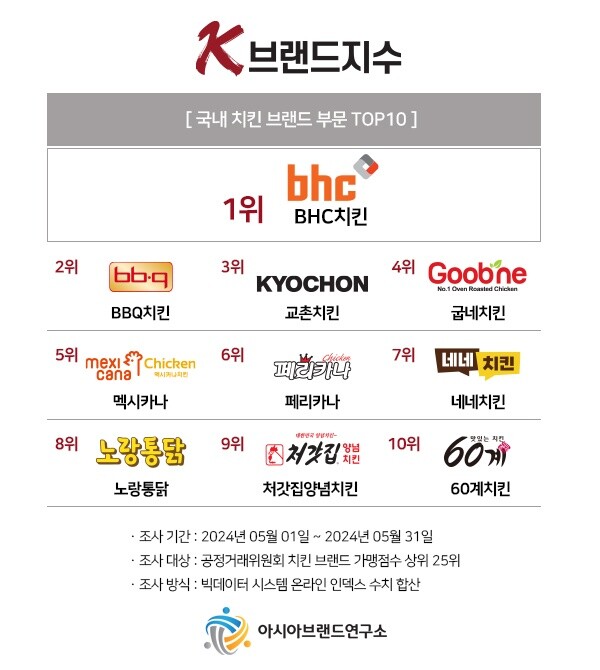 [하비엔뉴스 = 박정수 기자] 빅데이터 평가 기관인 아시아브랜드연구소는 ‘K-브랜드지수’ 치킨 브랜드 부문 톱10을 발표하고, 1위에 bhc치킨이 선정됐다고 20일 밝혔다.