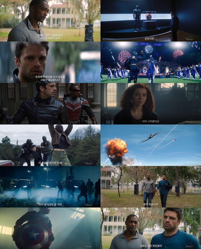 이와 함께 공개된 메인 예고편에는 캡틴 아메리카가 남긴 방패를 두고 맹훈련을 하고 있는 '팔콘'의 모습이 시선을 사로잡는다. 이어 대중들을 향해 "상징이란 사람들이 의미를 부여하지 않으면 아무것도 아닙니다"라는 대사와 함께 국가로 방패를 환원하는 '팔콘'과 캡틴 아메리카 슈트를 입고 등장하는 '존 워커'의 모습이 담겨 극의 흥미로움을 더한다. 타노스가 일으킨 블립 사태 후 혼돈으로 뒤덮인 세상에서 정체불명의 슈퍼 솔져 군단 '플래그 스매셔'는 대규모 전투를 준비하며 사회를 위협한다. '플래그 스매셔'의 리더인 '칼리'는 "이 세상은 우리 거야. 이제 돌이킬 수 없어. 이미 시작됐어요"라는 대사와 함께 다시 한 번 블립 사태를 일으켜 세상의 질서를 바로잡겠다는 다짐을 전한다. 세상에 닥친 거대한 위협을 막고자 공중과 지상을 오가며 파워풀한 액션을 선보이는 '팔콘'과 '윈터 솔져'는 극강의 긴장감을 유발시킨다. 디즈니+를 통해 공개된 에피소드 속 '팔콘', '윈터 솔져' 그리고 '플래그 스매셔'의 대결이 어떻게 그려질지, 국가가 선정한 제2의 캡틴 아메리카 '존 워커'와 사이에서 진정한 캡틴 아메리카로 거듭날 이는 누구인지 궁금증을 자아낸다.