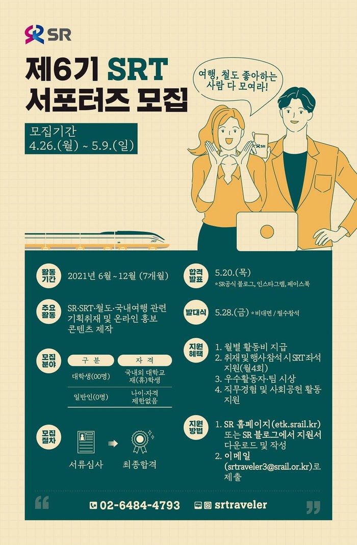 [하비엔=김재훈 기자] SRT 운영사 SR(대표이사 권태명)은 5월 9일(일)까지 SR 서포터즈 ‘SRTraveler’ 6기를 모집한다고 28일 밝혔다.