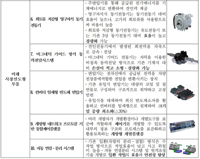 또 ‘미래시장 선도형 부품개발’은 미래 시장선도가 가능하고 잠재 시장규모가 큰 선도형 부품 5종에 대한 기술 개발과 성능검증을 지원하여 국내 부품산업 시장경쟁력을 높이고 세계시장 진출 기반을 마련할 수 있도록 할 계획이다.