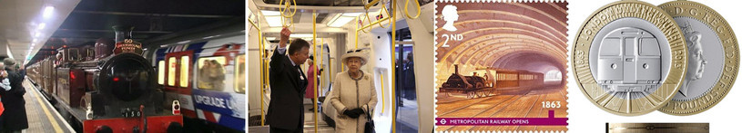 | ▲ (사진 왼쪽부터) 지하철 증기기관차 열차, 지하철에 승차한 영국 여왕, 기념우표, 기념주화. |
