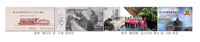 | ▲ 일본 ‘철도의 날’ 기념 입장권과 중국 ‘철로절’ 포스터와 행사 및 기념 우표. |