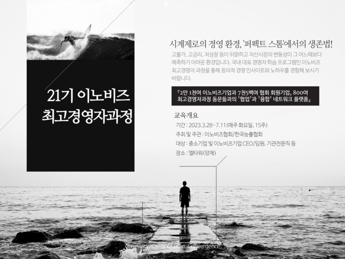 한편 다음달 28일부터 시작되는 제21기 이노비즈 최고경영자과정은 서울 양재동 엘타워에서 매주 화요일 오후 5시부터 8시 30분까지 진행된다. 모집기간은 다음달 10일까지이며 선발 인원은 50명 내외다.