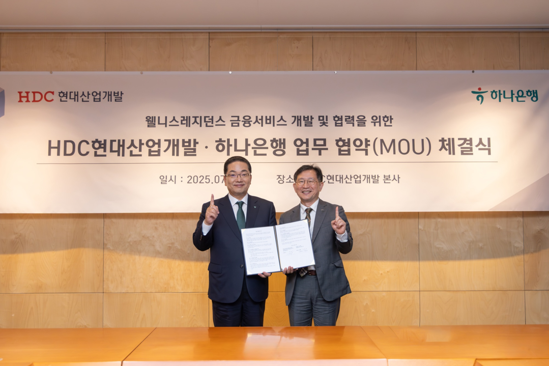 HDC현대산업개발은 하나금융그룹의 시니어 특화 브랜드인 하나더넥스트의 상품과 서비스 도입을 위한 업무협약을 체결했다. 지난 22일 HDC현대산업개발 본사에서 진행된 이번 협약식에는 정경구 HDC현대산업개발 대표이사, 이호성 하나은행장 등이 참석했으며, 서울원 웰니스 레지던스 입주민들에게 자산, 건강, 문화, 여가 등 삶의 전반적인 요소를 지원할 수 있는 통합 서비스를 제공하는 데 상호 협력하기로 했다.