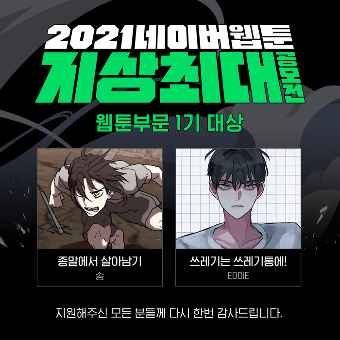 금일(28일) 네이버웹툰에 따르면 ‘2021 지상최대공모전’ 웹툰 부문 1기 대상으로 송 작가의 ‘종말에서 살아남기’와 EDDiE 작가의 ‘쓰레기는 쓰레기통에!’가 선정됐다.