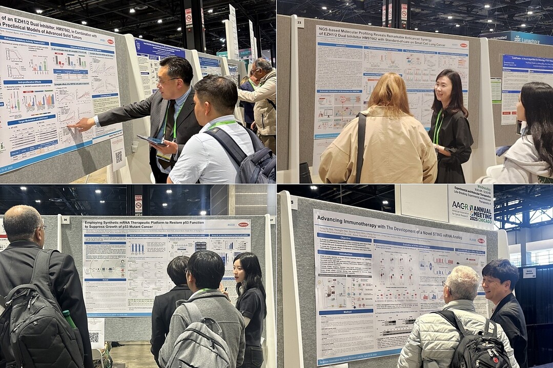 | 지난 4월25일부터 30일(현지시각)까지 미국 시카고에서 열린 ‘미국암연구학회(AACR 2025)’에서 한미약품 R&D센터 연구원들이 혁신 항암신약 연구 내용이 담긴 포스터를 토대로 참석자들에게 설명하고 있다. [사진=한미약품] |
