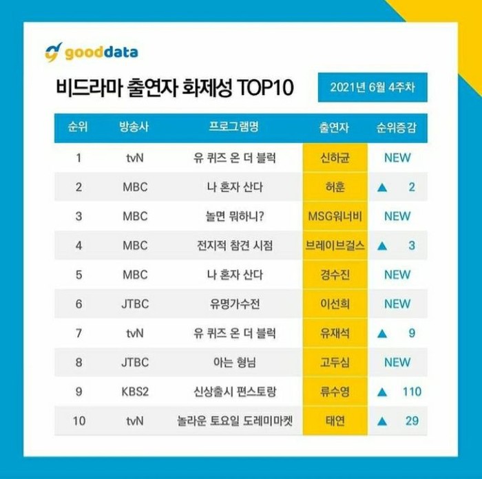 29일 굿데이터에 따르면 배우 신하균이 tvN ‘유 퀴즈 온 더 블럭’에 출연, 6월 4주차 비드라마 출연자 화제성에서 1위에 오르며 영향력을 입증했다.