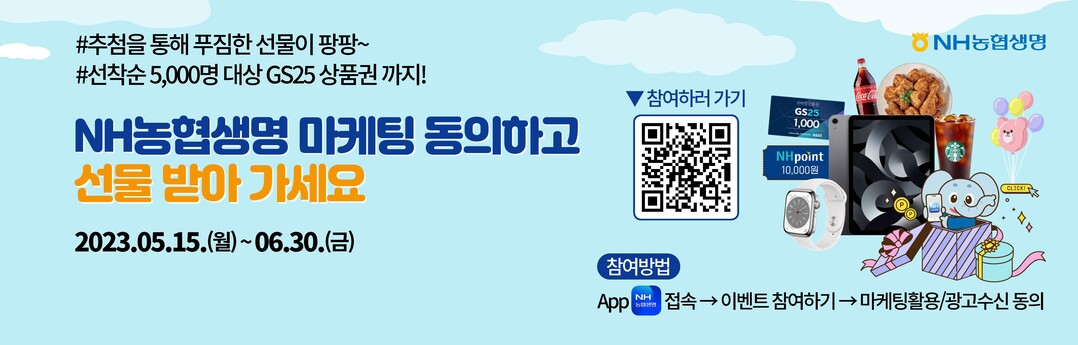 NH농협생명은 ▲GS25상품권 1000원권 5000명(선착순) ▲아이패드에어 5세대(2명) ▲애플워치시리즈8(5명) ▲굽네치킨 고추바사삭+콜라(30명) ▲NH멤버스 포인트 1만원(100명) ▲스타벅스 아메리카노(200명) 등 경품을 선사한다.
