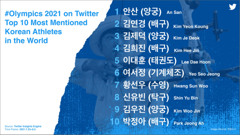 | ▲사진 설명: 2021년 올림픽 관련 트윗량 기준 - 전세계에서 가장 많이 언급된 대한민국 선수 TOP10 |