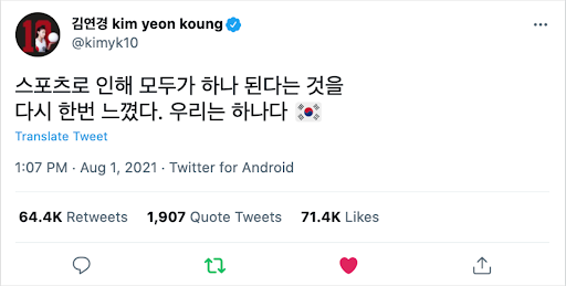 한일전 승리를 이끌어 감동을 선사한 배구 대표팀 주장 김연경 선수가 두번째로 많이 언급된 것으로 확인됐으며, 이어서 양궁 김제덕, 배구 김희진, 태권도 이대훈, 기계체조 여서정, 수영 황선우, 탁구 신유빈, 양궁 김우진, 배구 박정아 선수 순으로 전세계 트위터에서 가장 많이 언급된 대한민국 선수로 기록됐다.