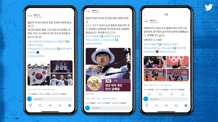양궁 대표팀 안산 선수의 ‘올림픽 양궁 역사상 첫 동일 대회 3관왕’ 소식은 국내 트위터 이용자들 사이에서 가장 많은 관심과 대화가 쏟아진 순간 중 하나였다. 안산 선수의 세번째 금메달 소식이 전해지자 ‘안산선수', ‘금메달 3개', ‘심박수 82’ 등 관련 키워드가 국내 트위터 실시간 트렌드를 장악했으며, 국제올림픽위원회(IOC) 공식 한국어 계정(@Olympiko)에 게재된 안산 선수의 3관왕 소식은 국내에서 가장 많이 리트윗(RT)된 올림픽 관련 트윗으로 확인됐다.
