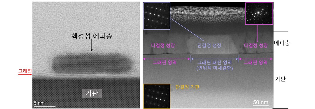연구팀은 원격 에피성장 초기단계의 수 나노미터 크기의 에피결정을 투과전자현미경으로 관찰해 미세결함이 전혀 없는 그래핀 영역에서도 원격 에피성장을 위한 핵생성이 시작되고 에피층으로 성장되는 것을 확인했다(그림 왼쪽).
