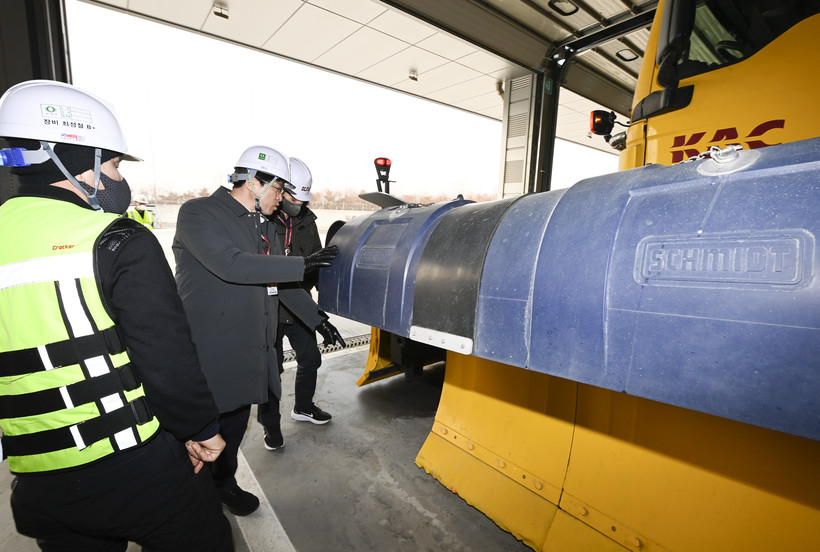 | ▲ 김두환 한국공항공사 김포공항장(왼쪽부터 2번째)이 장비고에서 제설장비 준비와 가동상태를 점검하고 있다. |
