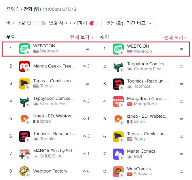 | ▲프랑스 만화 카테고리 매출-다운로드 순위 1위 차지한 네이버웹툰 |