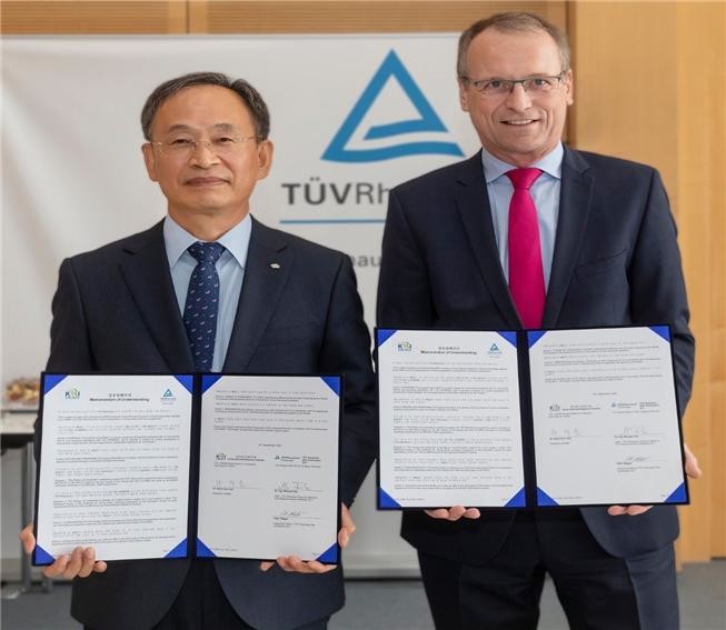 | ▲한석윤 철도연 원장(왼쪽)과 미카엘 푸비 TUV라인란드 그룹 회장(19일 독일 쾰른 TUV 라인란드 본사). |